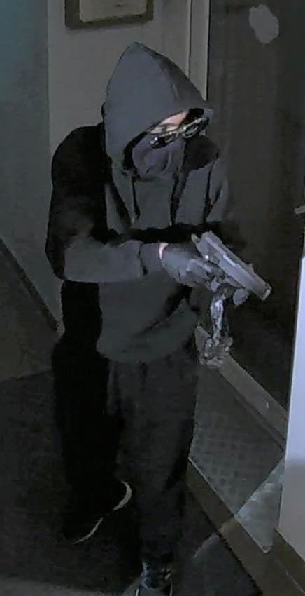 Täterbeschreibung: schwarz gekleidet, mit Kapuze über dem Kopf, schwarze Sonnenbrille und mit schwarzem Schal über Mund und Nase maskiert. Auf den Fahndungsfotos kann man zudem Sportschuhe mit Streifen erkennen.