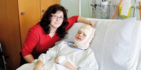 Reden ist für Andreas Leibetseder derzeit unvorstellbar, mühsam versucht er, Brei zu essen, ohne seine geschwollenen Lippen allzu weit öffnen zu müssen. Der Elfjährige aus Berg bei Rohrbach zwinkert unter einem riesigen Kopfverband hervor, der nur ein kleines Quadrat für sein Gesicht freilässt. Der Bub wurde am Mittwoch zwei Stunden lang operiert: Mit mehreren Platten korrigierten die Ärzte im Linzer AKH seinen beidseitigen Unterkieferbruch.