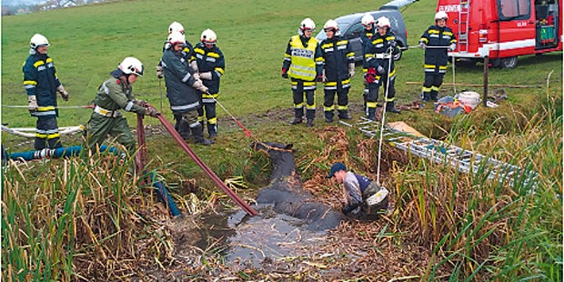 Tierischer Einsatz für die Feuerwehr am Sonntag in Sonnberg (Bez. Urfahr-Umgebung) im Mühlviertel. Gegen Mittag war ein Pferd in einen kleinen Teich gestürzt und schaffte es aus eigener Kraft nicht mehr aus dem Wasser. Die alarmierten Florianis pumpten das Wasser so weit ab, dass dem Pferd Rettungsgurte angelegt werden konnten, und zogen das völlig erschöpfte, aber unverletzte Tier heraus.