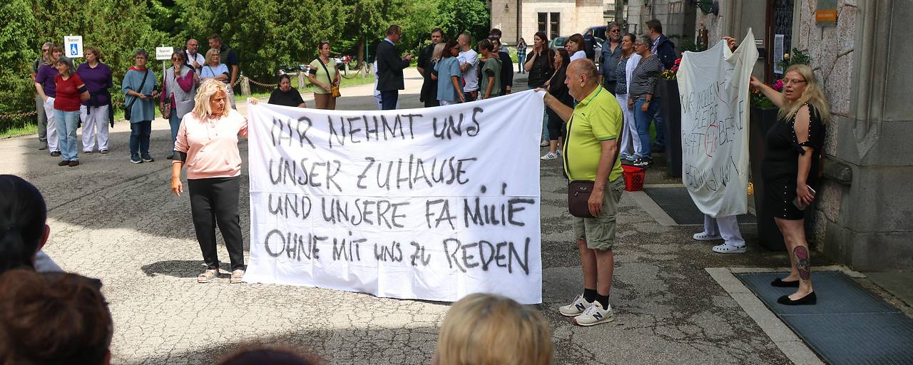 Der zuständige Landesrat Christian Dörfel (ÖVP) wurde am Dienstag unter Buhrufen und Beschimpfungen empfangen. Die Belegschaft, Angehörige und Bewohner sind traurig und zornig zugleich. Sie hielten Plakate wie "Ihr nehmt uns unser Zuhause und unsere Familie" in der Hand.