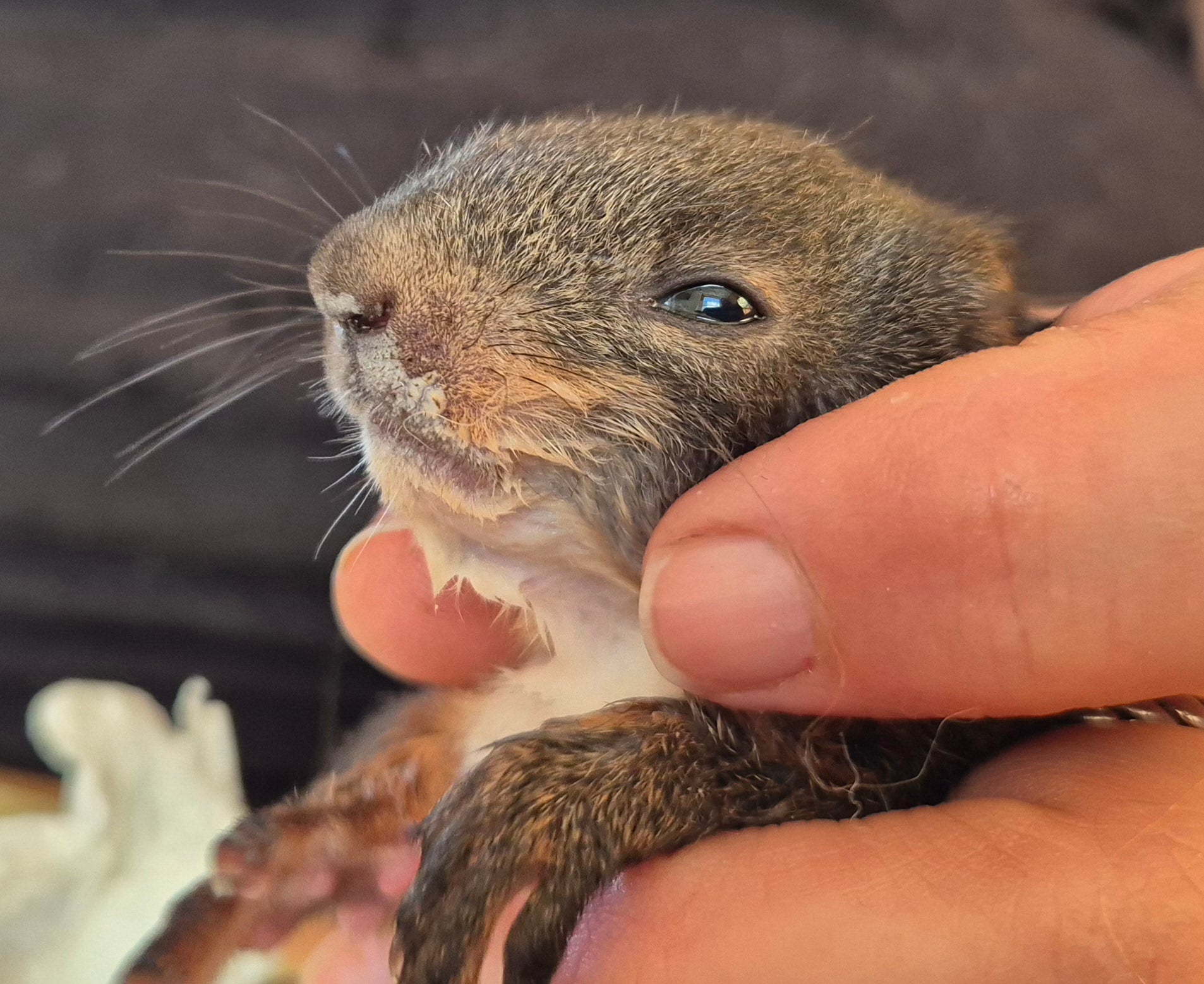 Ein verletztes Eichhörnchen-Baby wurde vor wenigen Tagen von einer Katze gebracht und am Tierschutzhof Pfotenhilfe aufgenommen. Es war unterkühlt und musste mit dem Fläschchen großgezogen werden.