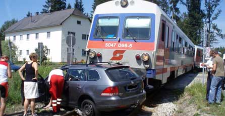 Einen schweren Zusammenstoß mit einem Zug hat am Samstag in Feldkirchen an der Donau (Bezirk Urfahr-Umgebung) in Oberösterreich ein deutsches Urlauberehepaar unverletzt überstanden. Der Wagen wurde von der Lok erfasst und noch 20 Meter weit mitgerissen.