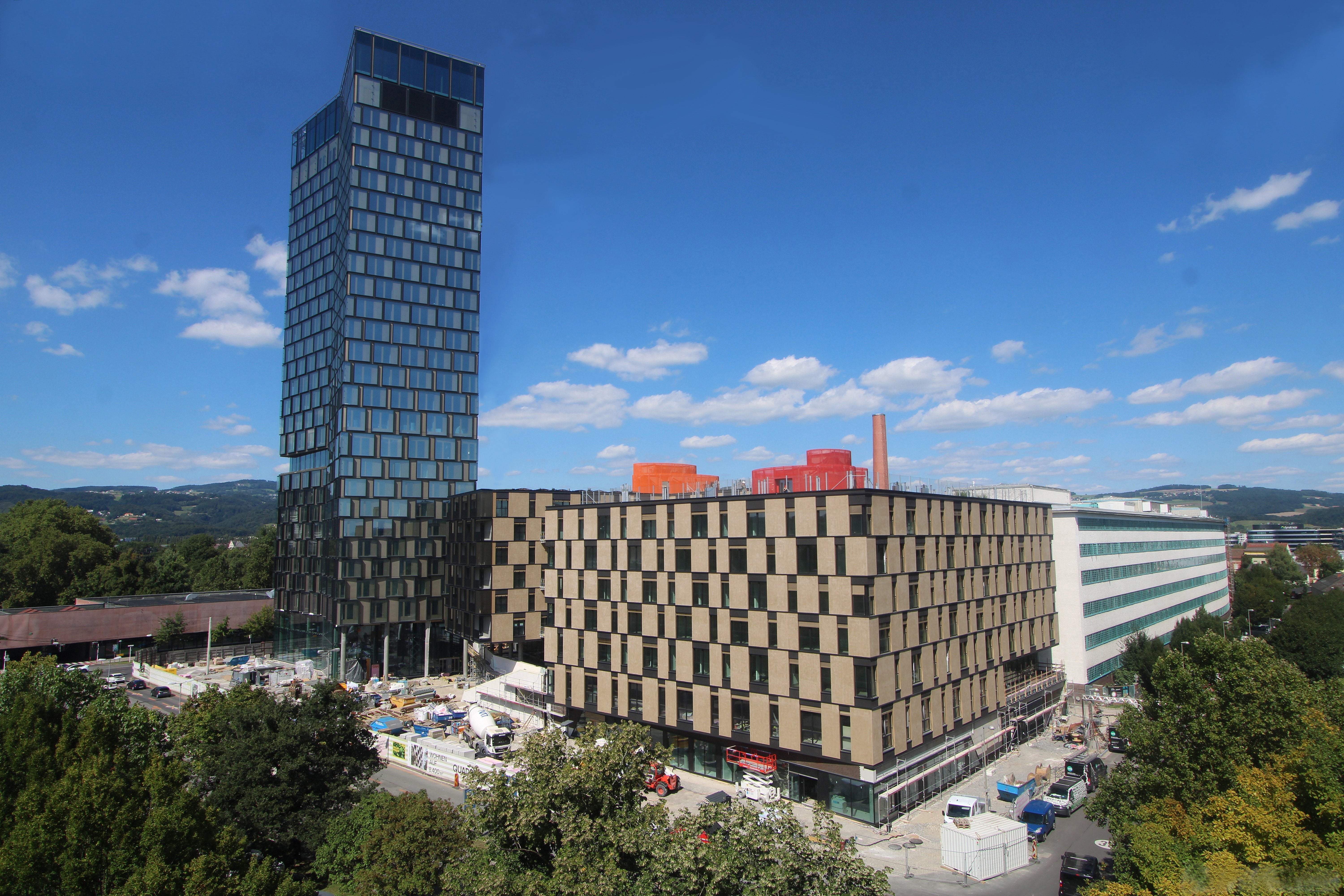 Linz. Mit der planmäßigen Fertigstellung der Glaselementfassade des QUADRILL Towers Ende August erreicht das namensgebende Großbauprojekt auf dem Gelände der Linzer Tabakfabrik ein bedeutendes Etappenziel. Der 109 Meter hohe Tower ist das höchste Hotel- und Bürogebäude Österreichs außerhalb Wiens.