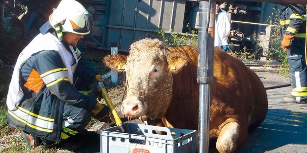 Die Folgen waren dramatisch. Während der Fahrer zum Glück nur leicht verletzt wurde, wurden mehrere Tiere unter dem Lkw eingeklemmt. Die unverletzt gebliebenen Stiere flüchteten in Panik in alle Richtungen. Vier Feuerwehren mit 59 Mann rückten an. Gmundens Bezirksfeuerwehrchef Stefan Schiendorfer: „Wir haben Landwirte aus der Umgebung als Hilfe angefordert.“