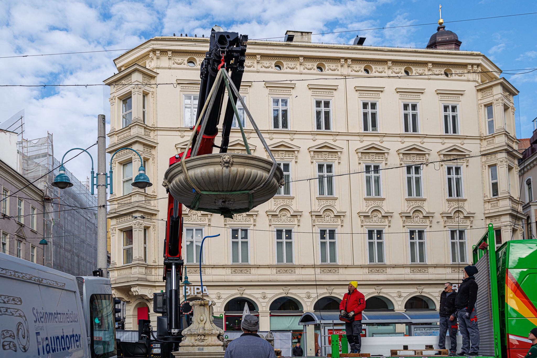 Nach dem fachgerechten Abbau durch die Restaurierungsfirma Fraundorfer entsteht bis Ende November eine temporäre Bauminsel mit Sitzgelegenheiten und Trinkbrunnen. "Der Sparkassenbrunnen wurde ursprünglich nicht für die Nutzung an öffentlichen Plätzen konzipiert, was eine hohe Wartungsintensität und damit hohe Kosten mit sich bringt. Die Arbeiten werden mit Ende November abgeschlossen. Damit wird sichergestellt, dass das Weihnachtsgeschäft nicht beeinträchtigt wird", sagt Bürgermeister Dietmar Prammer (SPÖ).