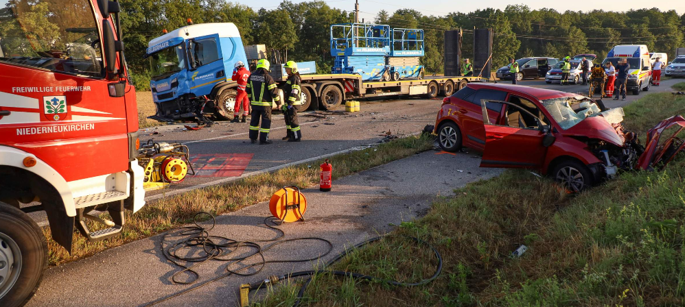 Die Bilder der Unfälle gleichen sich sehr. Am Mittwoch gegen 6.15 Uhr war der 29-jährige Lenker eines roten Pkws mit einem Lastwagen auf der L564 Richtung Niederneukirchen zusammengeprallt. Der rote Kleinwagen wurde auf die Wiese geschleudert, der eingeklemmte Fahrer hatte keine Chance. Er war auf der Stelle tot.