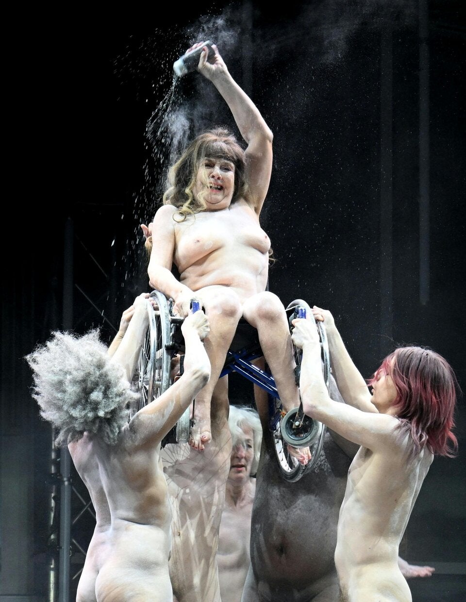 Völlig nackt begann Uhlich die Aufführung mit einem Solo, das dann von zehn Tänzerinnen und Tänzern – ebenfalls wie Gott sie schuf – weitergeführt wurde. Dabei wurde Puder in die Luft geschleudert, die nackten tanzten dann durch die Staubwolke.