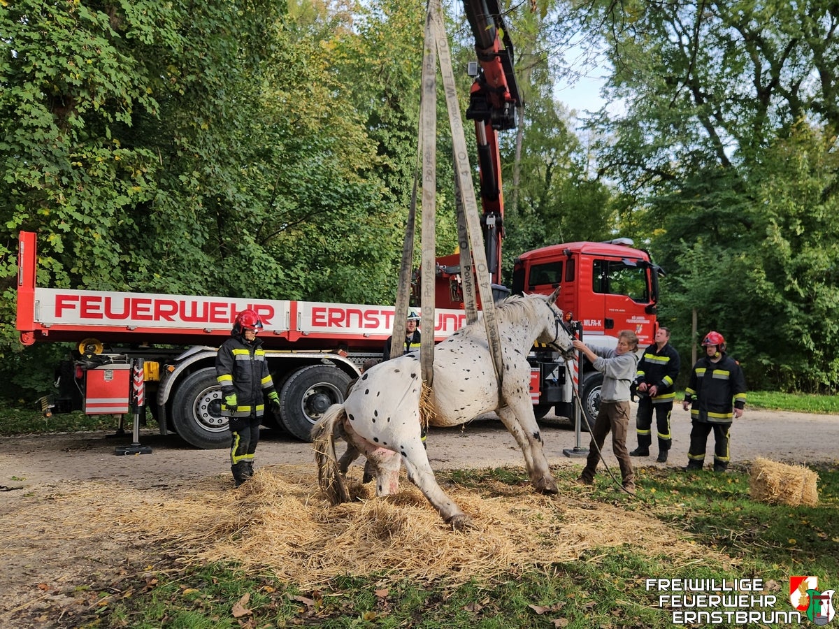 NÖ. Zu dem tierischen Einsatz kam es Donnerstagmorgen beim Schloss Ernstbrunn im Bezirk Korneuburg: Da es den Mitarbeitern eines Gestüts und der Besitzerin nicht gelang, die gescheckte Hannoveranerstute aus der Stolperfalle, in die sie eingebrochen war, zu befreien, wurde die Feuerwehr zur Unterstützung gerufen.