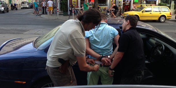 Täter verhaftetIn den nächsten Sekunden geht alles Schlag auf Schlag: Zwei Beamte stürzen mit gezogener Waffe vor den Augen Dutzender Menschen auf das Fahrzeug zu. Reißen die Türen auf und ziehen den Täter aus dem Fahrzeug.