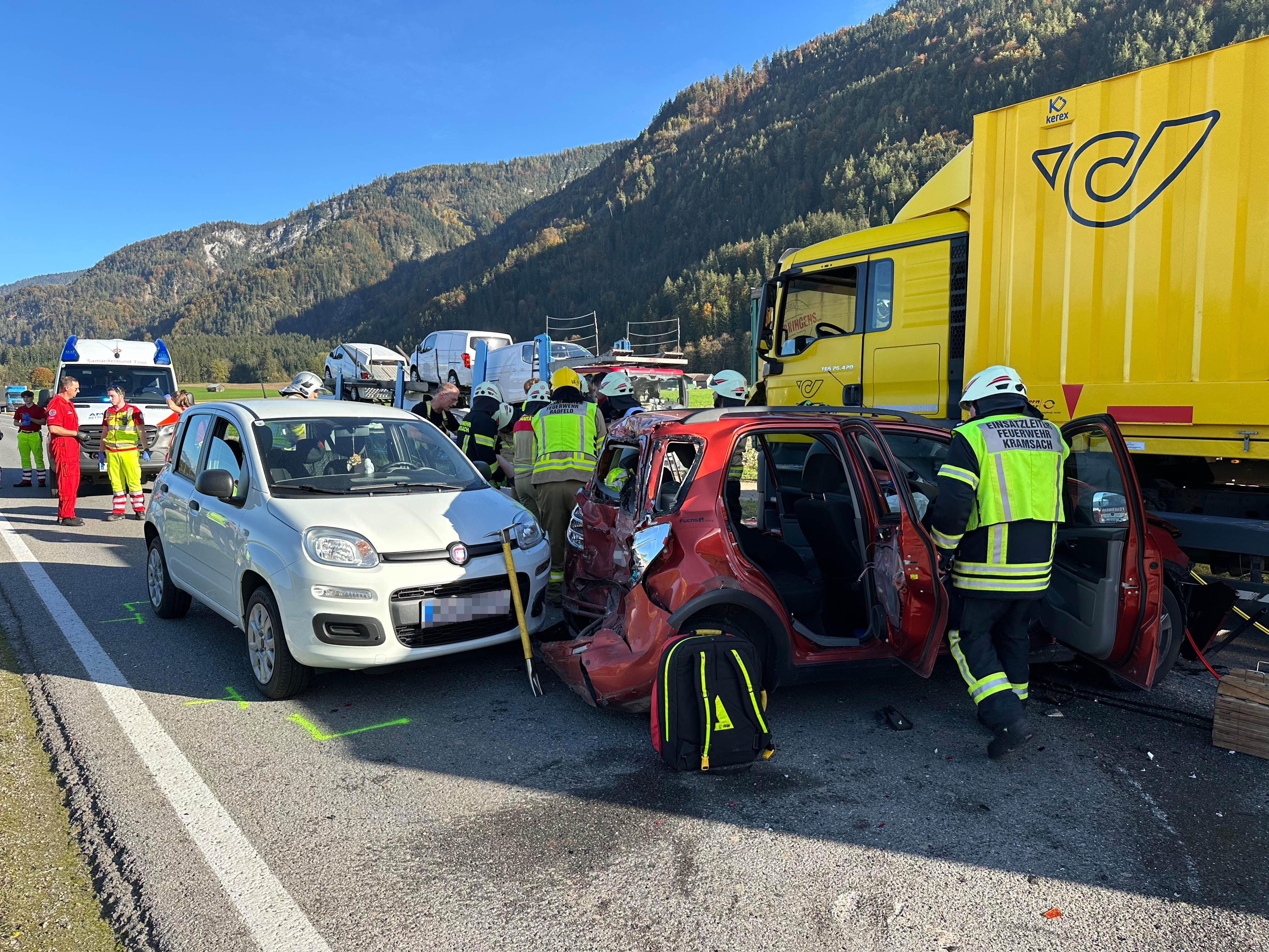 Ein 19-Jähriger und 43-Jährige wurden schwer verletzt und mussten mit der Bergeschere befreit werden. Der Pkw des Junglenkers war zuvor nach einer Kollision mit einem Lkw auf die Gegenfahrbahn geschleudert worden.