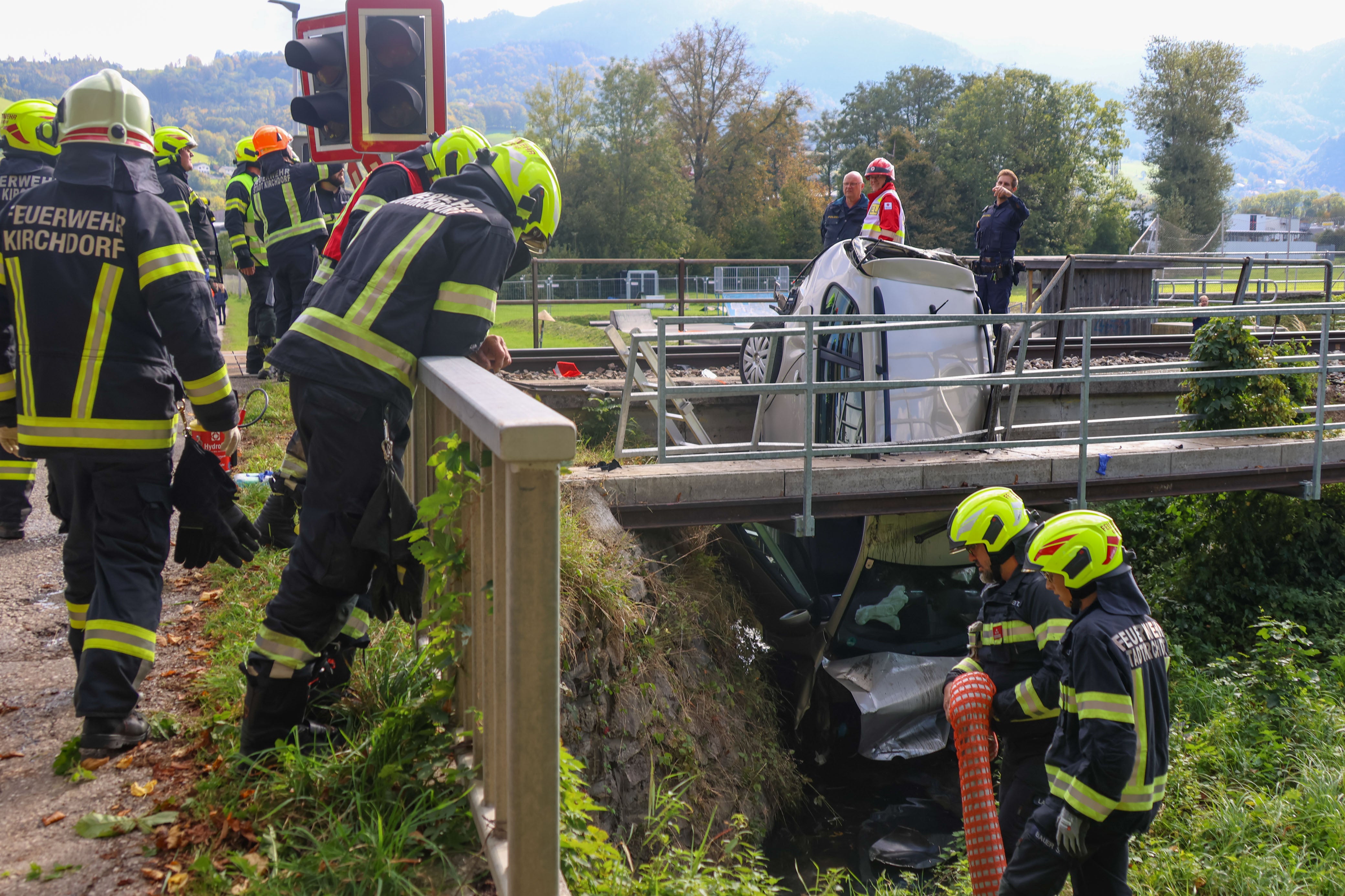 Bei dem Zusammenprall wurde der Pkw dann neben den Bahnübergang geschleudert und kam dort senkrecht zwischen einem Wasserdurchlass und einer Kabelbrücke zum Stillstand bzw. blieb dort stecken. Die Einsatzkräfte der Feuerwehr und der Rettung mussten eine Person aus dem Unfallwrack befreien. Sie wurde nach notärztlicher Erstversorgung in ein Klinikum eingeliefert.