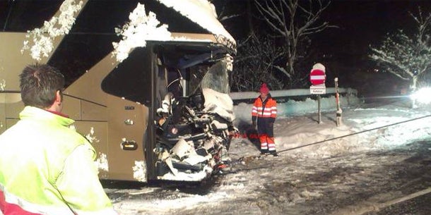 Bei dem schweren Verkehrsunfall auf der Mondseer Straße bei St. Gilgen dürften am Montagnachmittag 20 Personen verletzt worden sein. Ein deutscher Reisebus war gegen 15.30 Uhr im dichten Schneetreiben in einer langgezogenen Kurve gegen einen Schotter-Lkw aus St. Wolfgang geprallt. Die Frau am Beifahrersitz des Busses - offenbar die Reiseleiterin - erlitt dabei schwere Verletzungen, die anderen Insassen wurden mittelschwer bis leicht verletzt oder erlitten Platzwunden.