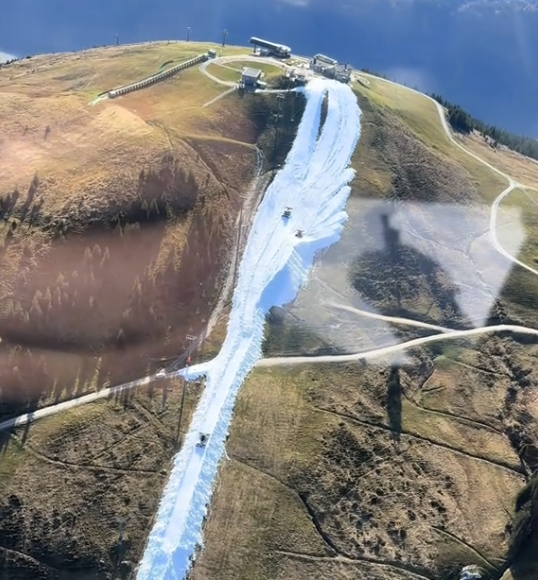 Ein weißer Streifen Kunstschnee zieht sich durch die Landschaft. Na, wenn das nicht Lust auf Skifahren macht. Breit ist die Piste nicht, aber für eine Abfahrt sollte es trotzdem wohl reichen. Das werden sich auch die Betreiber gedacht haben.