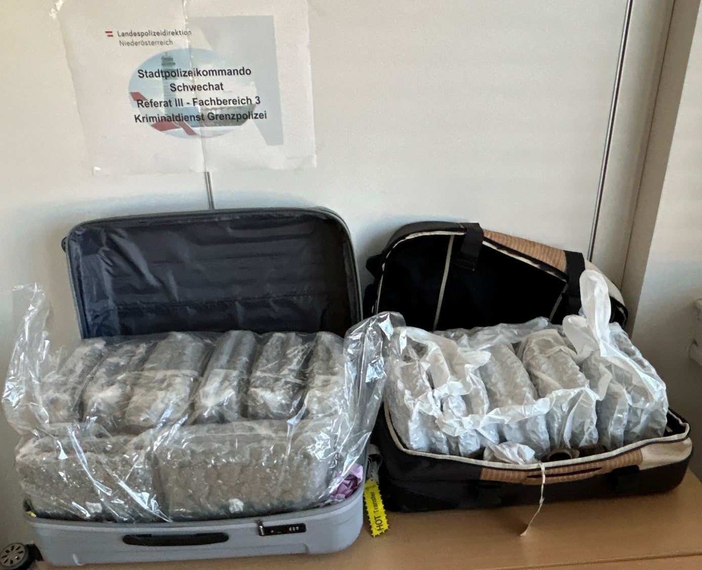 In zwei Koffern wurden 35 Vakuum-Packs mit je etwa einem Kilo Drogen entdeckt. Ein 20-Jähriger, der sich auf dem Weg von Bangkok (Thailand) über Österreich nach London befand, wurde am Abfluggate festgenommen.