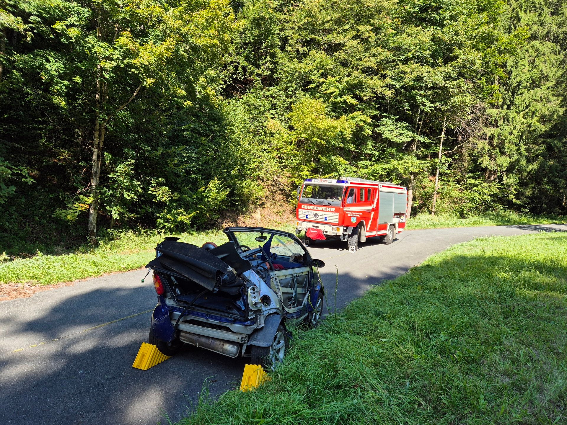 Wie die Feuerwehr Krispl in einer Presseaussendung mitteilte, fiel der Wagen durch ein Waldstück und landete knapp vor einem Bach. Die Bergung des Toten gestaltete sich für die 35 Feuerwehrleute wegen des unwegsamen Geländes schwierig und aufwändig.