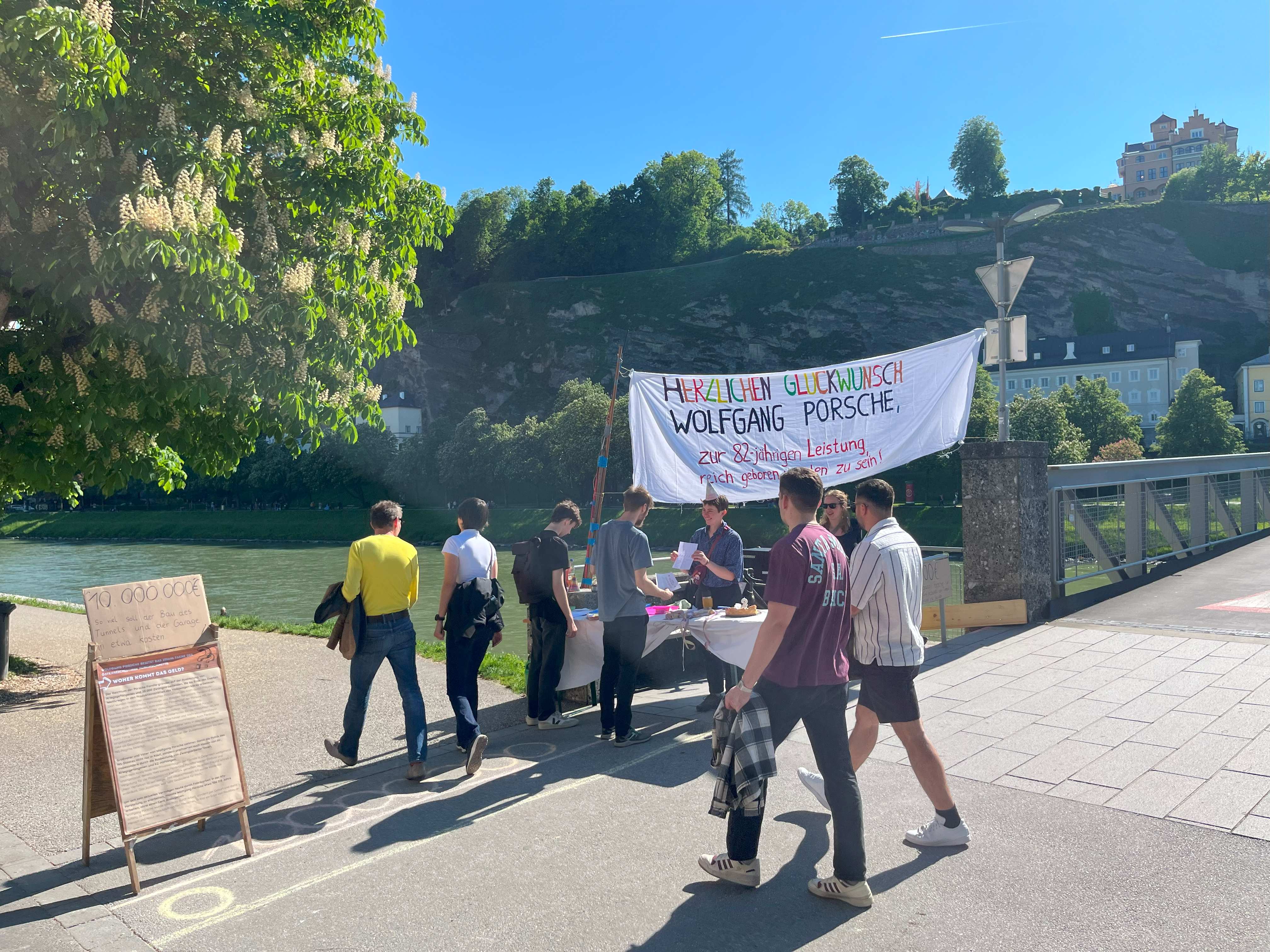 Mit Partyhüten und Kuchen protestierten Tunnel-Gegner am Müllner Steg gegen den geplanten Porsche-Tunnel durch den Kapuzinerberg in der Mozartstadt. Anlass war der 82. Geburtstag von Wolfgang Porsche, der symbolisch "gefeiert" wurde. Die Gruppe kritisierte, dass sich reiche Einzelpersonen wie Porsche Einfluss auf öffentliche Bauprojekte sichern können, während andere kaum Geld für das alltägliche Leben haben. "Es geht hier nicht um einen normalen Tunnel, sondern darum, ob die Stadt für alle da ist oder für einige wenige Superreiche", so die Aktivisten. Sie fordern, das Projekt zu stoppen und die Stadt vor privaten Prestigeprojekten zu schützen.