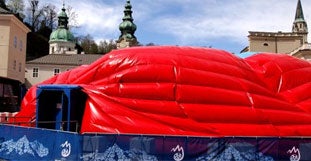 Das Riesenzelt, das im Herzen von Salzburg auf dem Kapitelplatz aufgestellt wurde, ist am späteren Vormittag vor der offiziellen Eröffnung Donnerstagmittag zusammengestürzt. Das Luftzelt habe plötzlich einen Riss bekommen, "etwas, was nicht passieren soll, aber passiert ist", sagte Pressesprecher Martin Roseneder. Jetzt werde daran gearbeitet, den Schaden so schnell wie möglich zu reparieren. Verletzt wurde niemand, so Roseneder.