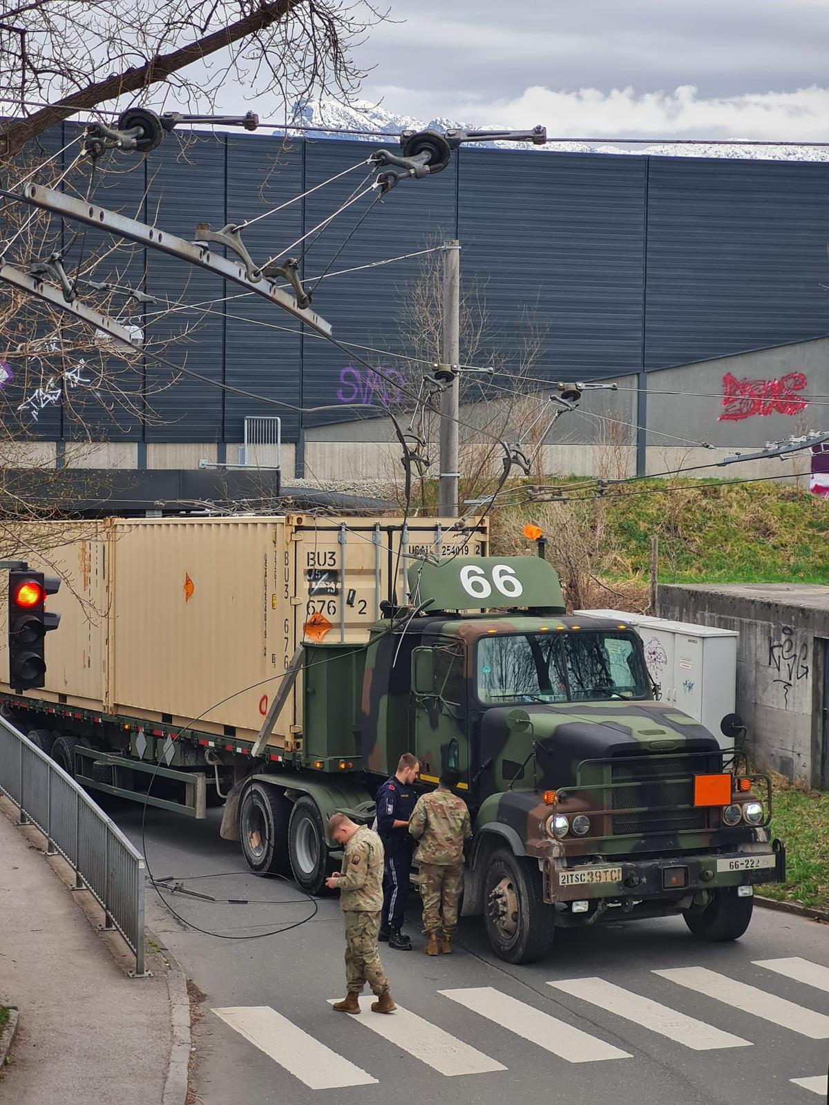 Der Truck hatte zwei Container geladen und in einer Busunterführung unter der Autobahn die elektrische Oberleitung abgerissen. Weil der Laster Munition bzw. Munitionsteile transportiert haben dürfte und eine Entzündung durch Strom befürchtet wurde, kam es aus Sicherheitsgründen zu einer großräumigen Sperre des Gebiets.