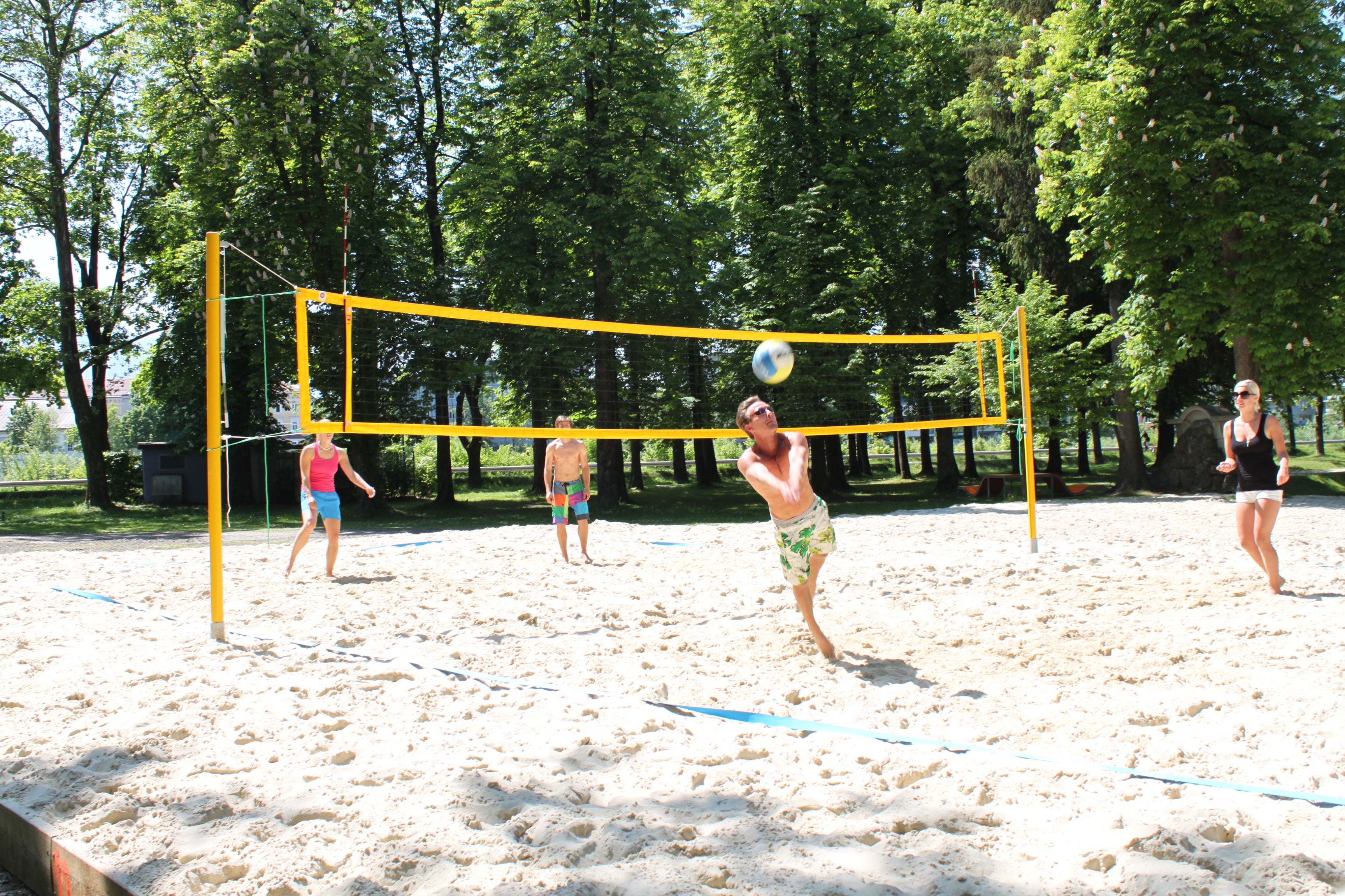 Ein Beachvolleyball-Platz ist schon aufgebaut und wurde bei strahlendem Sonnenschein am vergangenen Wochenende auch schon von einigen Salzburgern genutzt. Das ist aber noch lange nicht alles: Der Platz lässt sich bei Bedarf ganz einfach umbauen und kann dann für Beachsoccer genutzt werden. Jeden Montagabend wird vom Verein Body and Balance ein Volleyball-Training angeboten.