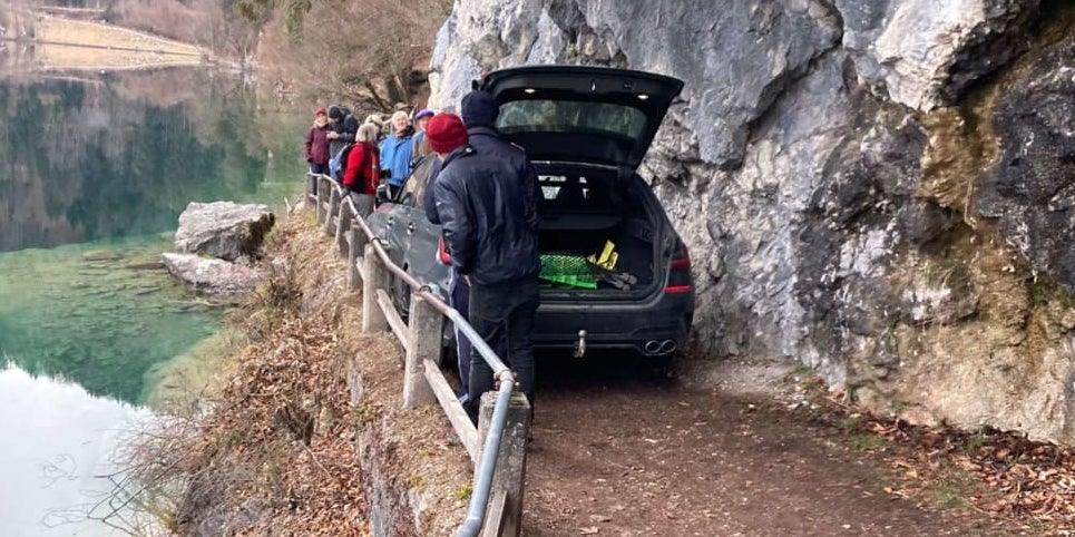 Obwohl der Weg immer enger wurde, fuhr der Tourist ungeachtet weiter. Dabei lies er sich weder von entgegenkommenden Wanderern, noch von der Tatsache, dass der Wanderweg auf der einen Seite von einem See und auf der anderen Seite von einer Felswand begrenzt wurde, verunsichern.
