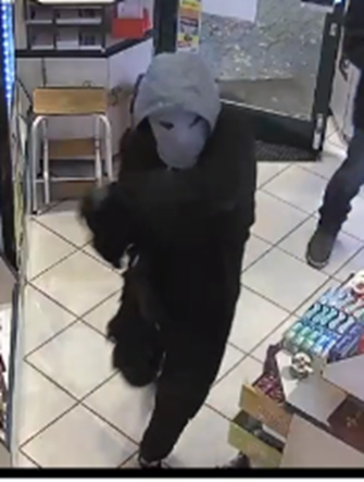 Ein Täter mit ungewöhnlicher Maskierung und möglicherweise verräterischem Schuhwerk wird als Trafikräuber von der Polizei gesucht. Wer (er-)kennt den eher jüngeren Mann, der sein Opfer auf Englisch anherrschte bzw damit Fremdsprachigkeit vortäuschte?