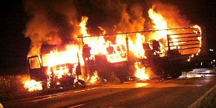 Das Fahrzeug landete auf der Gemeindestraße - Lkw stand in Vollbrand.