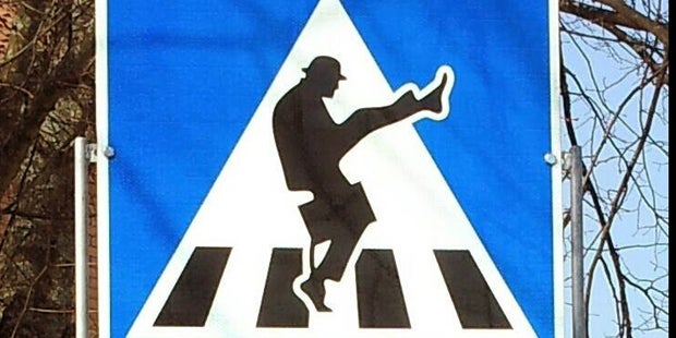 An beiden Seiten der Fahrbahn steht ein recht ungewöhnliches Zebrastreifenschild: In Anlehnung an einen Monty-Python-Sketch macht das Männchen auf dem Schild komische Verrenkungen beim Überqueren der Straße. Und genau das machen die Fußgänger in der Gemeinde nahe der schwedischen Grenze auch - viele zumindest.