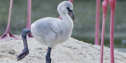 Das Aussehen der frisch geschlüpften Küken erinnert noch gar nicht an das eines Flamingos: Ihre Beine sind dick, ihre Schnäbel sind noch gerade und das Daunenkleid ist unscheinbar grau. Erst im Alter von etwa drei Jahren sind die Vögel bis zur letzten Federspitze rosa gefärbt. Für das leuchtend rosa Federkleid sorgen im Freiland Farbstoffe in den Krebsen, die die Flamingos kopfüber mit ihren Schnäbeln aus dem seichten Wasser filtern. Damit sie auch im Zoo ihre Farbe nicht verlieren, erhalten sie auch hier dieses spezielle Nahrungsmittel.