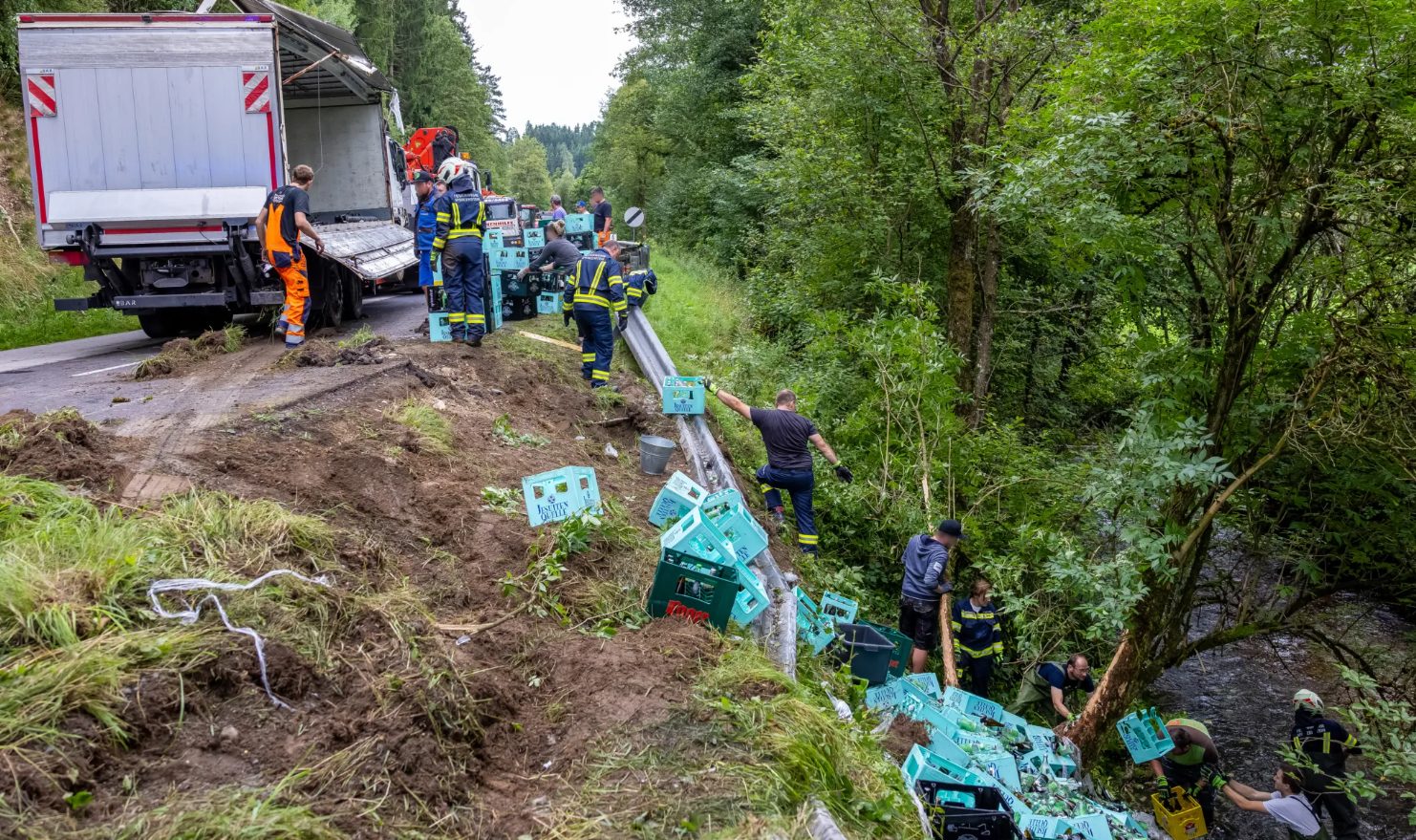 Der Lastwagen-Lenker war aus noch ungeklärter Ursache von der Fahrbahn abgekommen und über eine Böschung gestürzt. Dort kam das Fahrzeug seitlich zum Liegen. Die Kisten Wasser, Bier und Wein verteilten sich auf der Böschung, viele davon landeten im angrenzenden Bach. Feuerwehr-Einsatzkräfte mussten dabei helfen die verstreuten Kisten und Flaschen zu sammeln. Aufwendig gestaltete sich auch die Bergung des Getränke-Lasters.