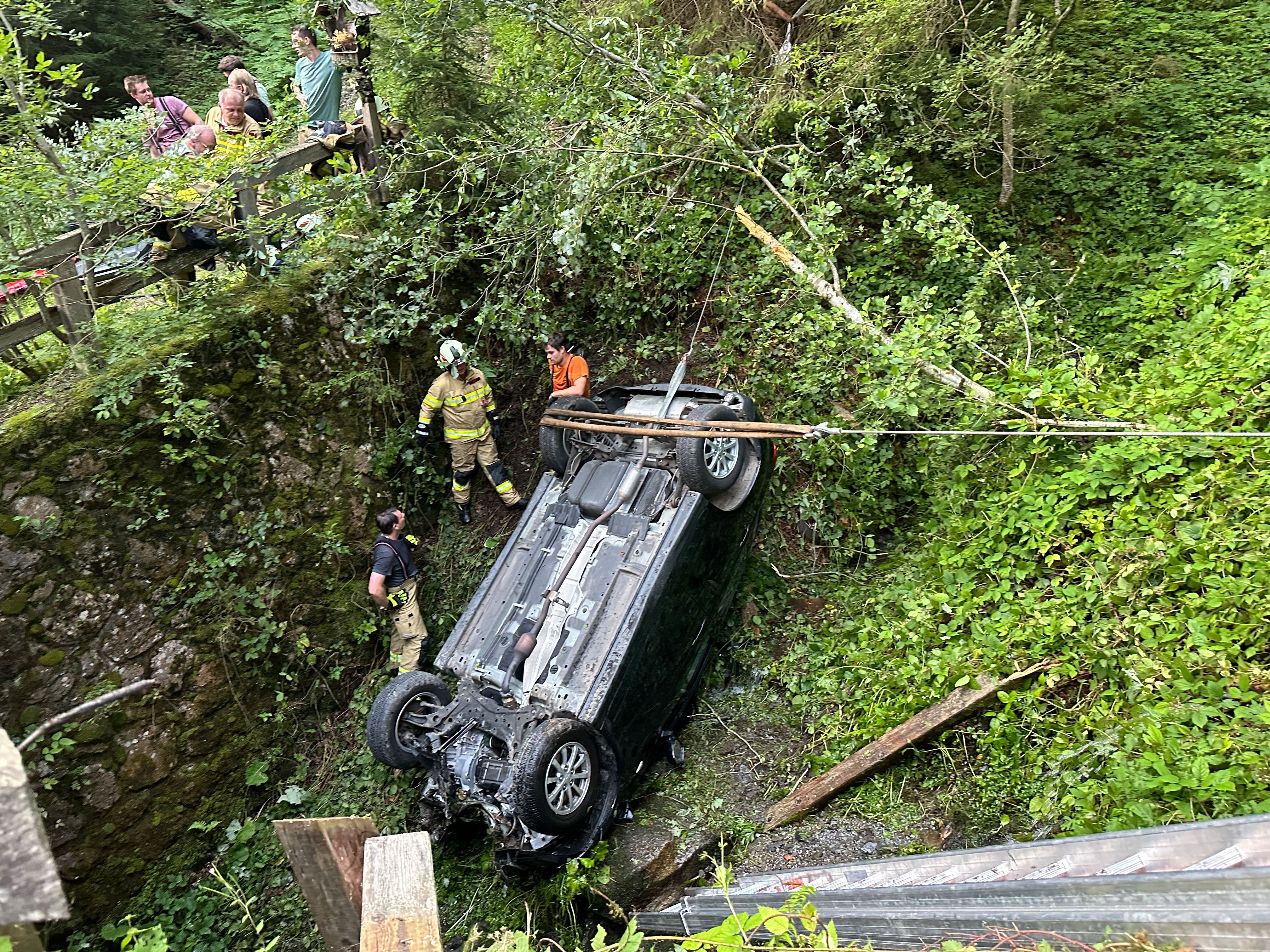 Im Bereich einer scharfen Linkskurve, vor Holzbrücke im Bereich des Hinterriesbaches geriet der Tiroler mit seinem SUV aus bisher unbekannter Ursache über den rechten Fahrbahnrand hinaus und stürzte mindestens vier Meter über die Böschung in das Bachbett.