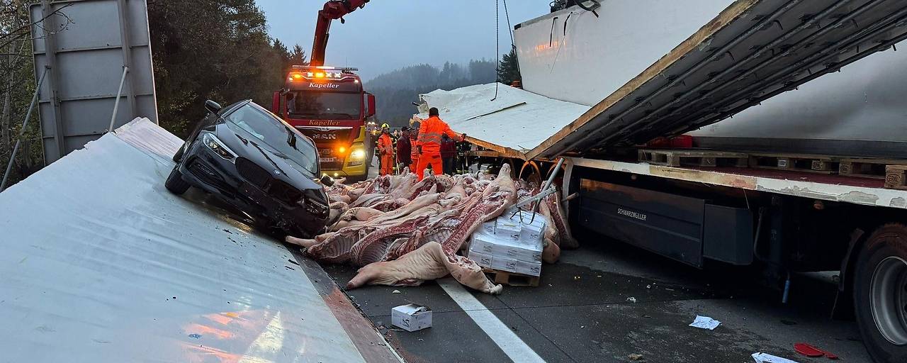 Die gesamte Ladung seines Kühlanhängers - 15 Tonnen Schweinehälften - verlor ein Lkw-Chauffeur bei einem nächtlichen Unfall auf der Tauernautobahn. Ein nachfolgender Autofahrer konnte nicht mehr bremsen und raste in die "Sauerei" auf der Fahrbahn.