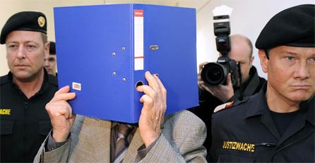 "The Guardian" online zum Verhandlungsbeginn: "Der 73-Jährige bedeckte sein Gesicht mit einer blauen Mappe, als er bei der Anklageband in St. Pölten erschien. (...) Er trug einen grauen Anzug, ein dunkles Shirt und eine gestreifte Krawatte. Er wurde gegen 9.30 in den Gerichtssaal gebracht, da konnten Medien und Öffentlichkeit einen ersten Blick auf den robusten Pensionisten werfen, der ein Doppelleben geführt hat (...) F. zeigte während der zehn Minuten, in denen Kameras im Gericht erlaubt waren, nicht sein ganzes Gesicht. Er blieb still, als österreichische TV-Journalisten ihn Mikrofone hinhielten und Fragen stellten."