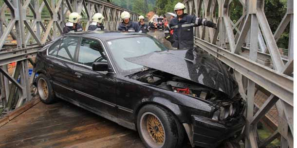 Zwischen den stählernen Geländerteilen einer Brücke ist ein Obersteirer am Sonntagnachmittag mit seinem Pkw stecken geblieben, wie die Feuerwehr Apfelberg mitteilte. Der Mann hatte gegen 15.35 Uhr aus ungeklärter Ursache die Herrschaft über sein Fahrzeug verloren und war gegen die Metallteile der Behelfsbrücke über die Mur bei Knittelfeld im Bezirk Murtal geprallt. Die Feuerwehr musste den Weg wieder freimachen und das Unfallauto bergen. Der Obersteirer blieb unverletzt.