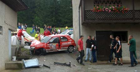 Der schwere Unfall wurde von einem plötzlichen Regenguss ausgelöst. Ein Teilnehmerauto war von der Fahrbahn abgekommen und in eine Hauswand gekracht.
