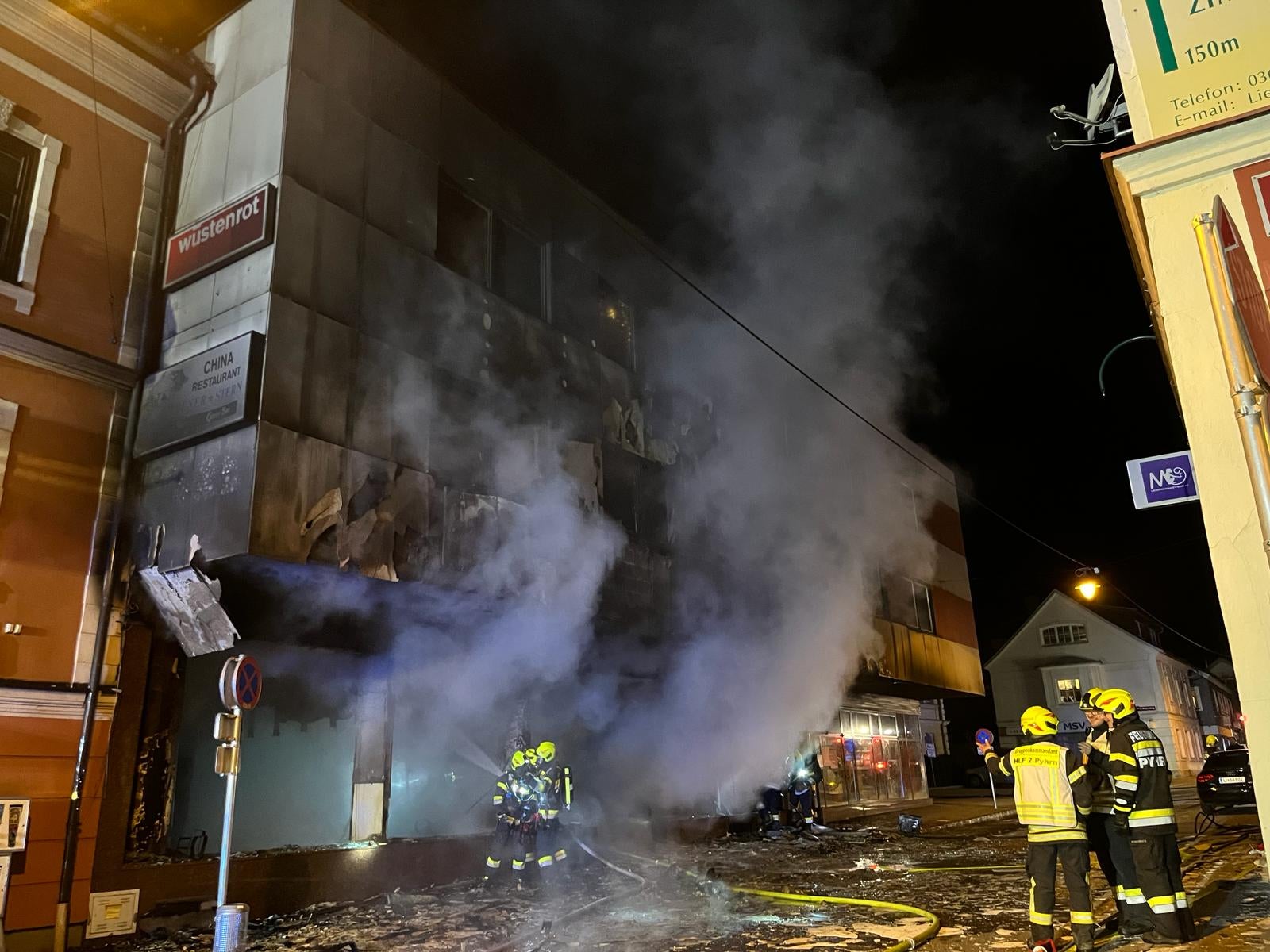 Stmk. Der Brand in dem Haus in der Ausseer Straße im Zentrum von Liezen brach in der Nacht auf Dienstag gegen 1 Uhr aus. Das Feuer dürfte in dem Geschäft im Erdgeschoss ausgebrochen sein.
