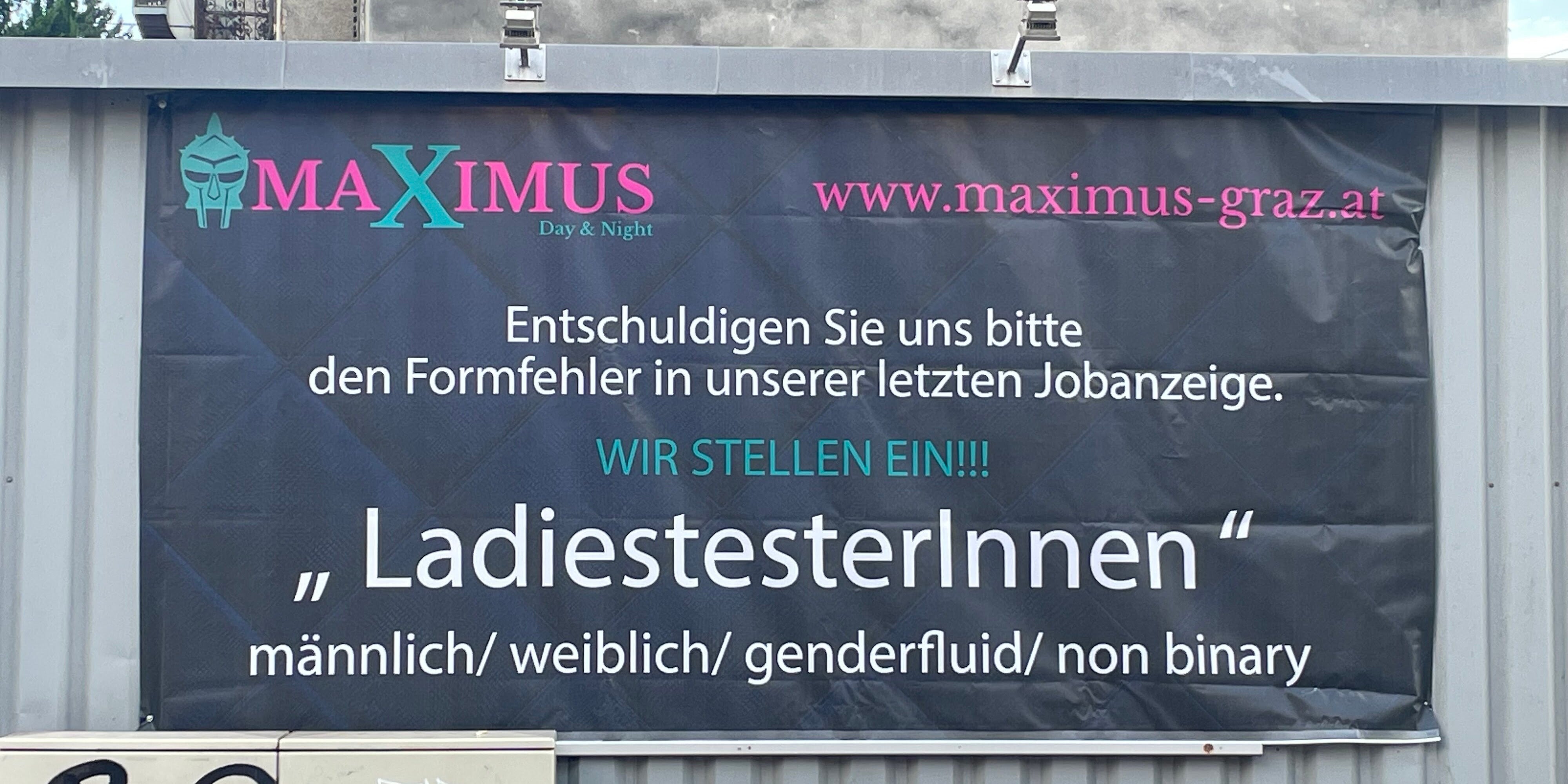 Doch nun legt der Bordellbetreiber sogar nach. Mit einem neuen Plakat an der gleichen Stelle, wie das steirische Newsportal www.5min.at berichtet. "Entschuldigen Sie uns bitte den Formfehler in unserer letzten Jobanzeige. Wir stellen ein!!! LadiestesterInnen. männlich, weiblich, genderfluid, non binary." Mit dem Gendern sollen sich ab jetzt wohl alle Geschlechter zum Testen melden dürfen. Es gibt keine Beschränkungen mehr.