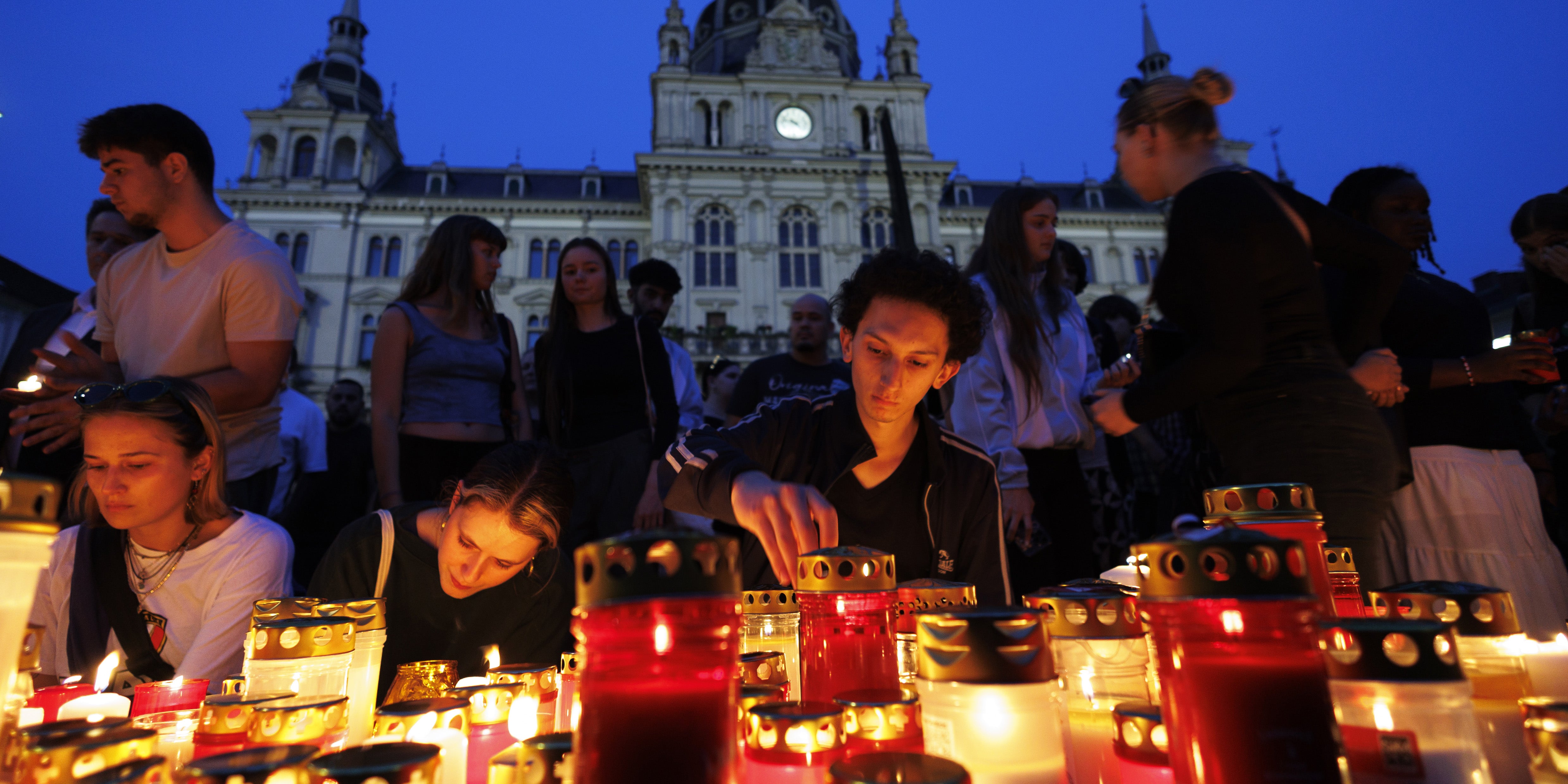 Hinter den Trauernden hing die schwarze Flagge am Grazer Rathaus und vereinzelt standen Betreuerinnen und Betreuer vom Kriseninterventionsteam bereit, um bei Bedarf den Menschen beizustehen. Eine spürbar bedrückte Stimmung erinnerte an das Lichtermeer 2015 nach der Amokfahrt von Alen R. durch die Grazer Herrengasse. Damals folgten Tausende Menschen einem Facebook-Aufruf zu einem "Kerzenmeer".