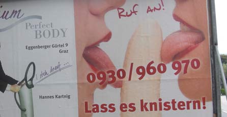 Ex-Sturm-Präsident Hannes Kartnig hat sich den Zorn der Grazer Sex-Sheriffs zugezogen. Kartnigs Werbefirma Perspektiven hat anzügliche Plakate für eine Sex-Hotline affichiert – das treibt jetzt die städtische „Watchgroup gegen sexistische Werbung“ auf die Palme. Die Plakate tragen den Titel „Lass es knistern!“. „Das einzige, was da offenbar knistert, sind die Scheine in Kartnigs Geldbörse“, ärgert sich SP-Frauenstadträtin Elke Edlinger. „Das ist keine Frage des guten Geschmacks sondern diese Form der sexistischen Werbung ist einfach unerträglich.“