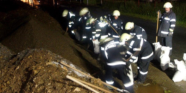 Feuerwehrleute beim auspumpen eines Kellers (Braunau, OÖ)