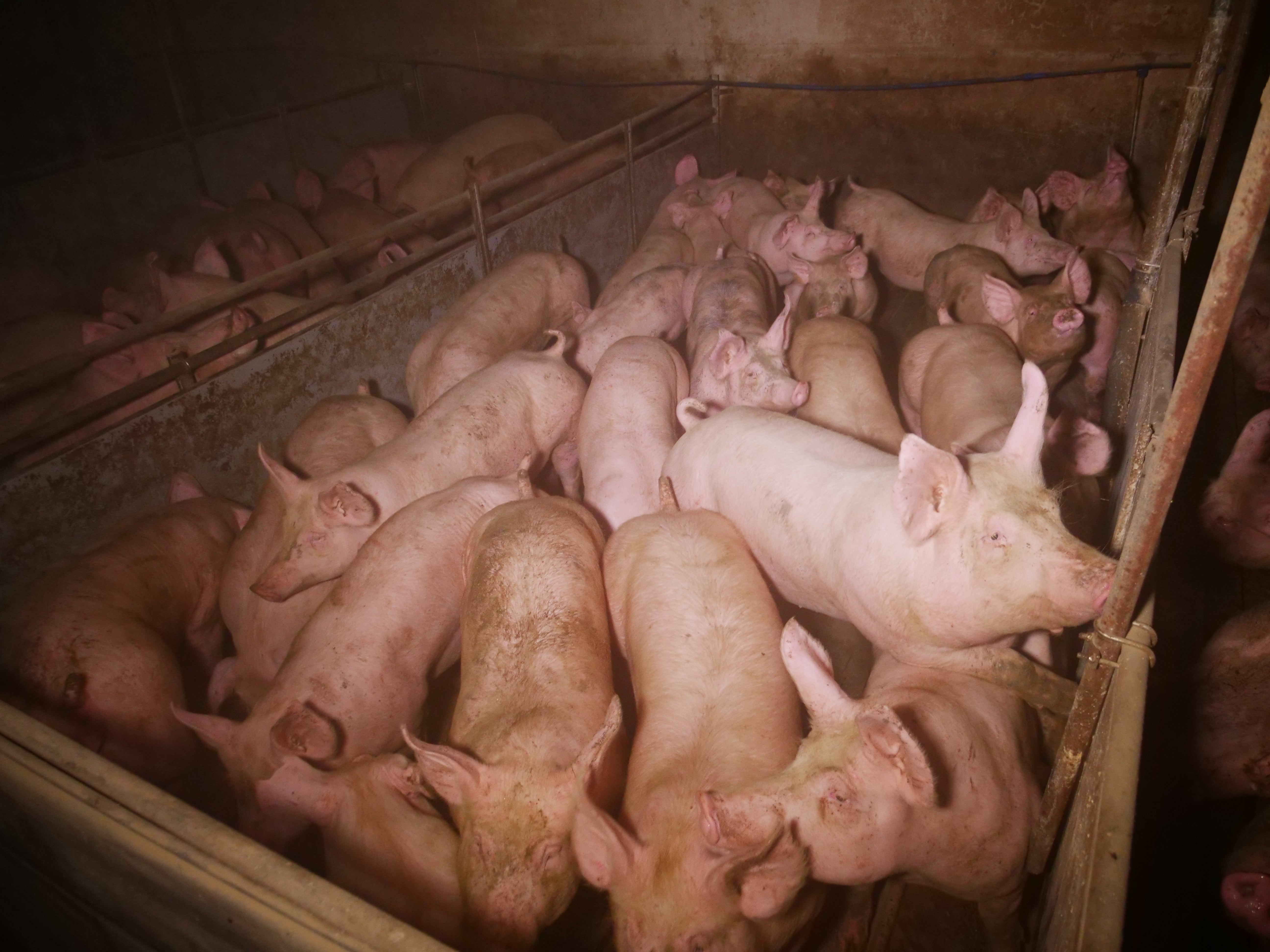 Verletzte Schweine inmitten von Artgenossen. Die Tiere werden zum Teil so eng gehalten, dass sie sich kaum bewegen können und auf dem Boden liegende Tiere treten. Einige Schweine haben offene und eitrige Wunden an den Gelenken und können kaum noch gehen.