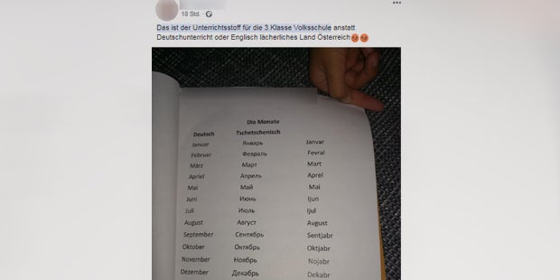 Die Facebook-Userin Jasmin N. zeigte sich Dienstag erbost. Sie postete ein Bild eines Vokabelblattes auf dem die Monate Jänner bis Dezember, sowohl auf Deutsch, als auch auf Tschetschenisch, sowie die passende Aussprache zu sehen sind. Das Blatt sollen die Kinder in der Volksschule Kapfenberg-Stadt erhalten haben.