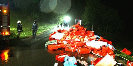 Ein mit Fleisch beladener Sattelschlepper hat am Freitagabend in Maxendorf, Bezirk Feldbach, seine Ladung verloren. Laut der steirischen Sicherheitsdirektion verteilten sich 20 Tonnen Fleisch auf der gesamten Fahrbahn der L202, die für mehrere Stunden komplett gesperrt werden musste.