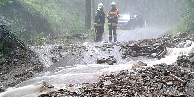 Genau einer Woche war die Marktgemeinde schon einmal von einem schweren Unwetter mit erheblichen Schäden betroffen. Am vergangenen Wochenende gab es in der Steiermark an jedem Nachmittag lokale Überschwemmungen und Murenabgänge infolge Gewitter und Starkregen, zuerst in Schladming, dann im Raum Voitsberg in der Weststeiermark und schließlich nördlich von Graz.