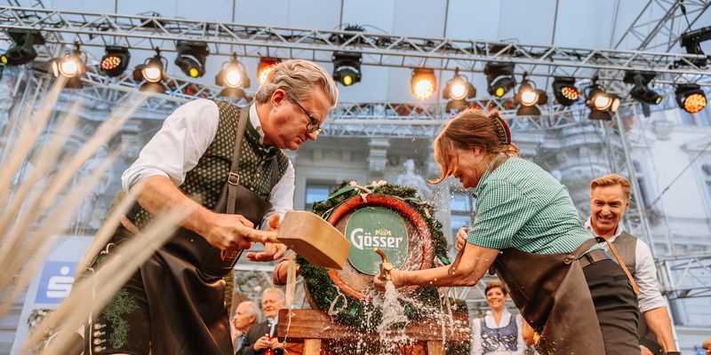 Graz. Alle Wege führten am Wochenende wieder nach Graz zum Aufsteirern. Beim Bieranstich durch Landeshauptmann Christopher Drexler war der Hauptplatz bereits gut gefüllt, die Stimmung aufgrund des Sommerwetters ausgelassen. Nur neun Schläge brauchte Drexler, um den Zapfhahn, den Bürgermeisterin Elke Kahr für ihn festhielt, um das Fass zu öffnen, damit das Bier fließen konnte. "Das Aufsteirern zeigt wie kaum eine andere Veranstaltung die Freude am Brauchtum, an der Tradition und die Begeisterung, Dirndl und Lederhose auszuführen. Wir alle setzen damit ein Zeichen, wie stark und stolz unsere Steiermark ist", sagt der Landeschef, der auch in Lederhose feierte. Elke Kahr kam in der Trachtenbluse. Wie sie verriet, ist ihr das 20 Jahre alte Dirndl zu klein geworden.