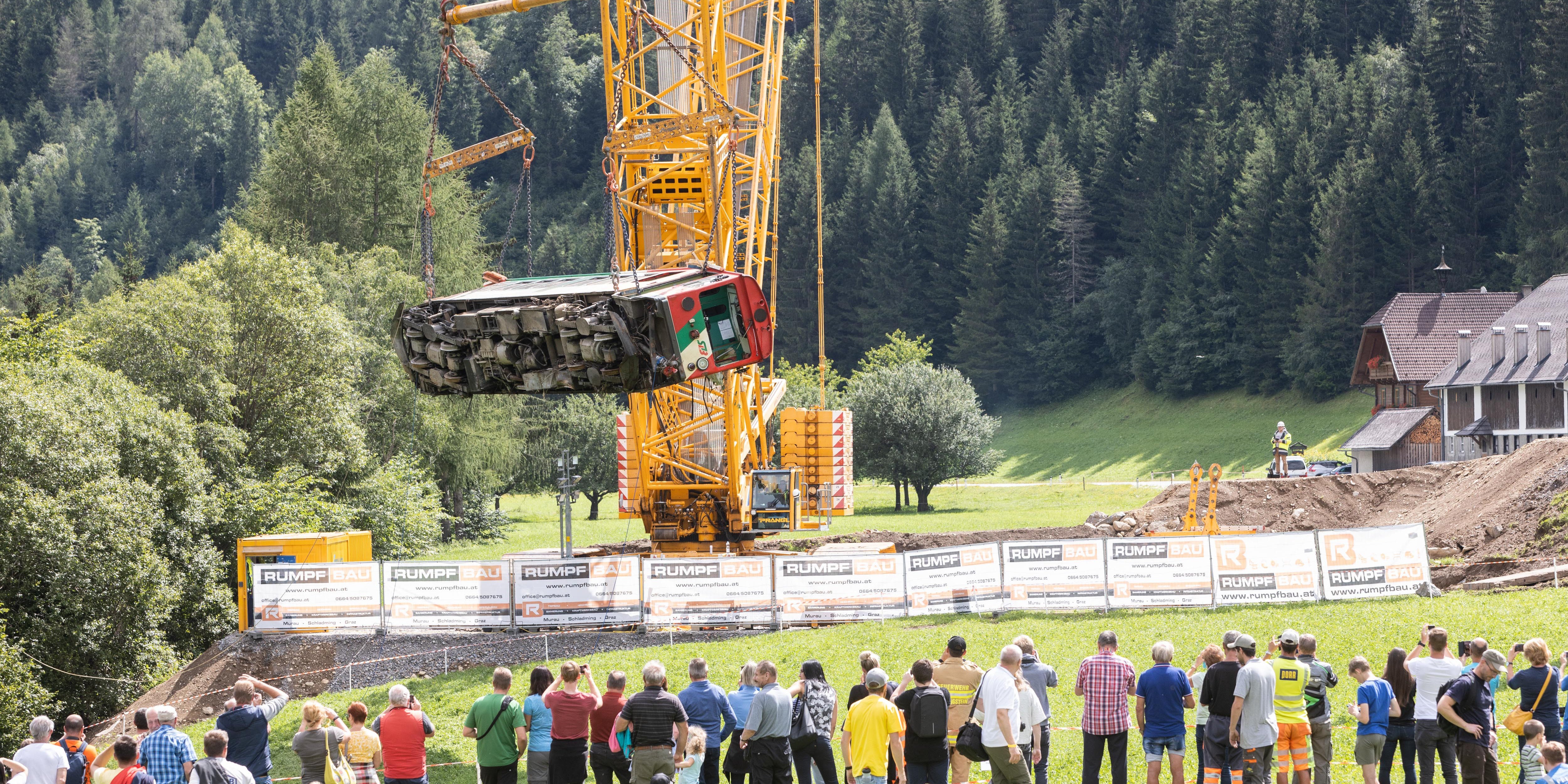 Ramingstein/Graz. Der nach einem nächtlichen Unwetter am Morgen des 9. Juli an der Landesgrenze Steiermark-Salzburg entgleiste Triebwagen der Murtalbahn ist am Freitagvormittag aus der Mur geborgen worden. Ein 600-Tonnen-Raupenkran hat das seitlich im Wasser liegende 32 Tonnen schwere Fahrzeug angehoben und über die Uferböschung und eine Geländekante zur Landesstraße geschwenkt. Am Nachmittag wird der Triebwagen grob gereinigt, aufgerichtet und auf einen Schwerlasttransporter verladen.