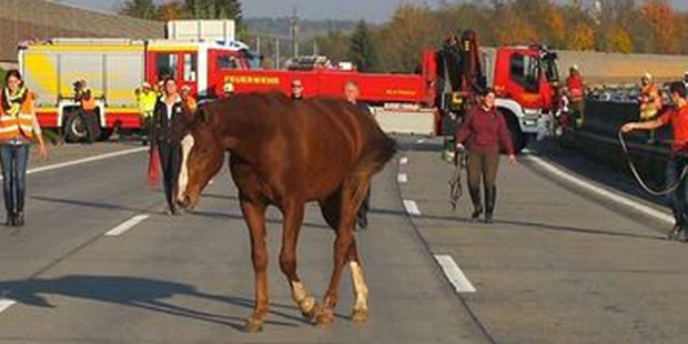 Nach einem Unfall wanderte ein junger Hengst eine Stunde lang auf der Fahrbahn.