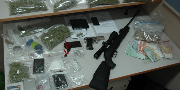Während etwa 3.000 Euro Bargeld, ein Kilogramm Marihuana und etwas "Speed" gefunden wurde, entdeckten die Beamten auch ein Luftdruckgewehr, eine Gaspistole und unzählige Suchtgiftutensilien. Schon zu Beginn der Hausdurchsuchung waren sechs Abnehmer in der Wohnung, weitere zehn Käufer kamen im Verlauf des Polizeieinsatzes noch dazu.