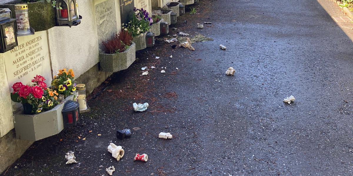 Dabei entnahm der Täter auf einer Länge von etwa 30 Metern überwiegend Grabschmuck (größtenteils aufgestellte Keramikengel) und warf diese auf den Asphaltboden, wodurch die Figuren beschädigt wurden.