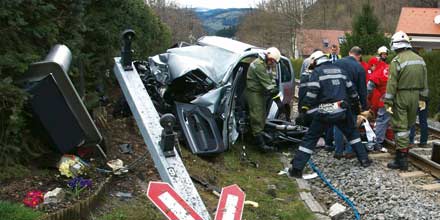 Auf der Fenninger-Kreuzung in Wies (Deutschlandsberg) kollidierte am Ostermontag gegen 13.30 Uhr ein Zug mit einem Auto. Ein aus Richtung Eibiswald kommender Pkw-Lenker dürfte das Rotlicht vor dem Bahnübergang übersehen haben und prallte gegen einen Triebwagen der Graz-Köflach-Bahn (GKB). „Der Wagen wurde durch den Aufprall mehrmals um die eigene Achse gedreht, bis er neben den Geleisen liegen blieb“, schildert ein Feuerwehrmann den bösen Unfall.