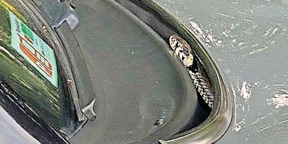 Eine Natter kroch während der Fahrt auf die Windschutzscheibe und starrte die Lenkerin an.